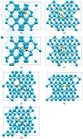 Apart from energetics, DFT calculations can provide detailed information on the structure of the defects. For example, in previous work [] the optimized structures for the GeVO, SnVO, PbVO, GeV, SnV, and PbV defects in Si were given (refer to Figure 14). These studies indicated that the oversized isovalent dopants (Sn or Pb) preferentially occupy the space between two semi-vacant lattice sites (i.e., the split–vacancy configuration) []. Nevertheless, when an Oi is present in the defect, it effectively prevents the Sn (or Pb) to shift towards the vacant site [].