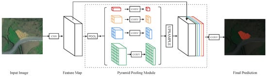 The structure of PSPNet is shown in Figure 3; the input layer obtains the feature layer of the input image through CNN, and the feature layer size is changed to 1/5 of the original through. Then, the obtained feature map is input to the pyramid pooling module. First, this module divides the input feature layer into 6 × 6, 3 × 3, 2 × 2 and 1 × 1 sized areas; the ave-pooling operation is performed in the divided area to obtain four feature layers of different sizes (corresponding to the green, blue, orange and red outputs in Figure 3, respectively); then, 1 × 1 convolution operations are performed on these feature layers; next, the number of channels of the feature layer is changed to one-fourth of the original; and finally, the feature layer is up-sampled by bilinear interpolation. The upsampled feature map and the feature layer obtained by CNN are concatenated, and finally, the final output is obtained through the convolution operation.