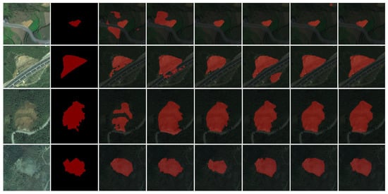A total of 51 remote sensing images of landslides were included in the test set; all of the images were from the eastern part of the Qinghai–Tibet Plateau in Bijie City, Guizhou Province, China. As shown in Figure 4, we show some landslide images in the test set, and none of the images in the test set participated in the training, through which we evaluated the performance of each model. We have selected some of these samples for analysis, as shown in Figure 5. The figure includes four samples of landslide images that occurred in different places, marked as Landslide I, Landslide II, Landslide III, and Landslide IV. Among them, I, II, and III are new landslides with various characteristics and shapes of landslides, and IV is an old landslide with inconspicuous characteristics of landslides. In addition, the figure also includes the label file of the landslide, which was used for comparison with the predicted map. We use the pretrained model to obtain the predicted map; we will analyze the predicted maps of the four landslide samples separately.