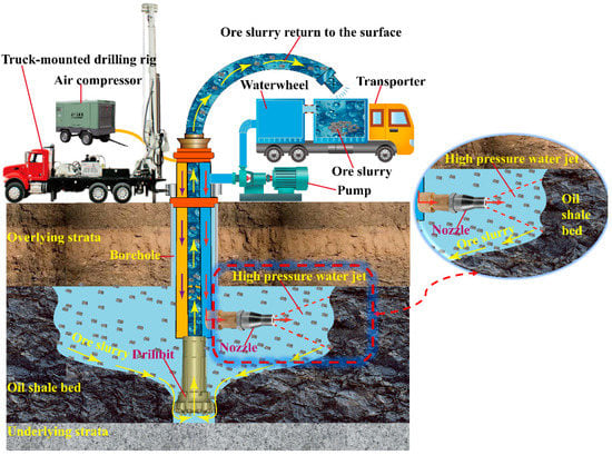 Oil shale is an unconventional oil and gas resource, as coal, oil, and natural gas provide non-renewable fossil energy [1,2]. Such resources worldwide are abundant, equivalent to more than 400 billion tons of synthetic shale oil, three times the world’s crude reserves [3,4]. The borehole hydraulic mining method has unique advantages for underground oil shale exploitation [5]. As shown in Figure 1, when borehole hydraulic mining technology is used to mine underground oil shale, first, drilling rigs must be used to drill holes that are 100~1000 mm in diameter and pass through oil shale layers. Second, the high-pressure water gun is inserted into the borehole, and the underground oil shale bed is broken into several small pieces by the high-pressure water jet from the nozzle connected to the end of the ejector. Then, it is stripped from the parent rock to form a solid–liquid two-phase flowable slurry at the bottom of the borehole. Finally, pneumatic or hydraulic lifting devices are used to extract slurry to the surface [6]. Borehole hydraulic mining technology has the advantages of low cost, short cycle, reliable use, easy operation, low labor intensity, and little environmental pollution [7].