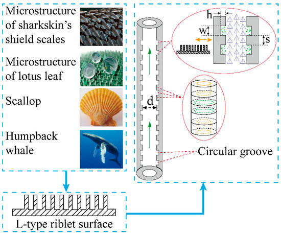 The rib drag reduction method was used in many fields and was shown to positively reduce fluid resistance [32,33]. In this study, according to the typical L-shaped rib, we proposed a new type of bionic circular tube (BCT), where the schematic diagram is shown in Figure 2.