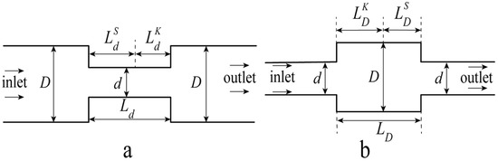 For the increase–reduction pipe diameter structure [35,40,41] (as shown in Figure 4b), the pressure drop calculation formula is