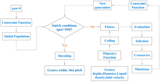 The inlet section L1 and outlet section L3 of the BSCN were regarded as two BCTs. The inlet velocity of the inlet section L1 of the BSCN was 1 m/s, the inlet velocity of the outlet section L3 of the BSCN was 14 m/s, and the liquid density was 1 kg/m3. In the groove depth range 0.1 mm–14.5 mm, the genetic algorithm was used to analyze and solve Formula (19) for the pressure drop example and the groove width, and the slot pitch of the structural parameters of a circular groove unit of the BSCN was obtained.