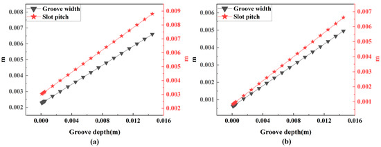 Groove width and slot pitch change under different groove depths: (a) inlet section of the BSCN and (b) outlet section of the BSCN.