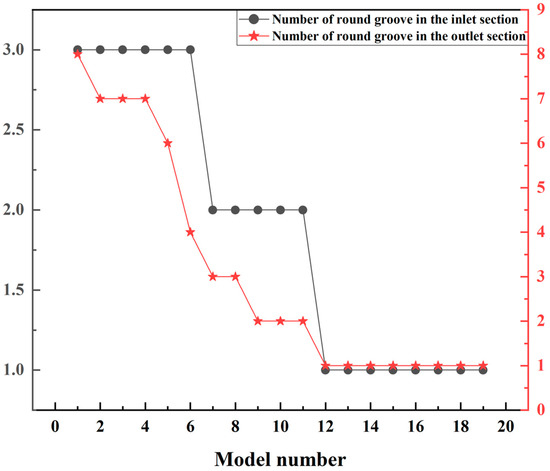 Based on the optimization results of the genetic algorithm, the number of grooves in the inlet and outlet sections of the BSCN was determined by combining the terms in the following Formula (21), as shown in Figure 9. The models of the BSCN and conventional straight cone nozzle were established.