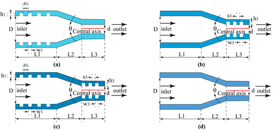 The comprehensive type of circular tube with a variable cross-sectional structure is a reduction–increase or increase–reduction structure, as shown in Figure 4. For a Newtonian fluid, the structure has a related mature formula for calculating the pressure drop [38,39].