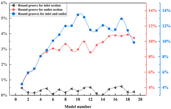 It can be observed from Figure 11 that the velocity increase rate of the BSCN was more significant than zero after the structural parameters were optimized. It was further noted that the resistance against the fluid flowing through the inner wall was reduced by setting circular grooves in the inlet and outlet sections of the conventional straight cone nozzle, and the drag reduction effect of the outlet section of the BSCN was better than that of the inlet section.