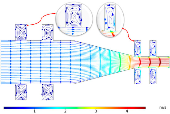 Figure 12 is the velocity vector diagram of the BSCN with the best drag reduction effect and a velocity increase rate of 13.45%. In Figure 12, each circular annular groove contained a swirl opposite the direction of the internal flow.