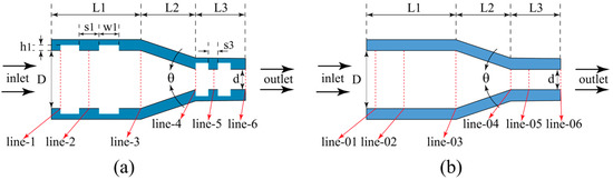 In Figure 4, and are the length of the reduction section and increase section (m), respectively. For the pipe diameter reduction–increase structure [35,40,41] (as shown in Figure 4a), the pressure drop calculation formula is