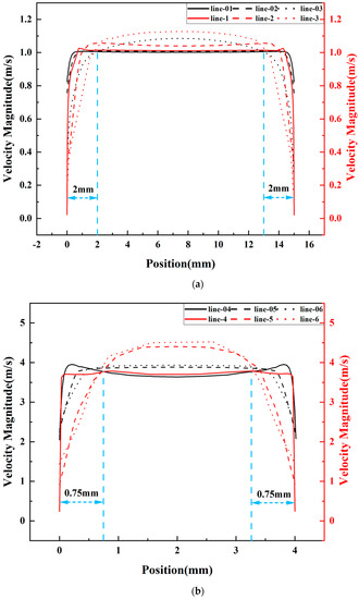 As shown in Figure 14, based on the results of the CFD numerical simulation, the value of the velocity at each dividing line was extracted, and the curve of the change in the velocity at each dividing line with the distance of the dividing line was plotted. Line01/line1 to line06/line6 represent the positions shown in Figure 13.
