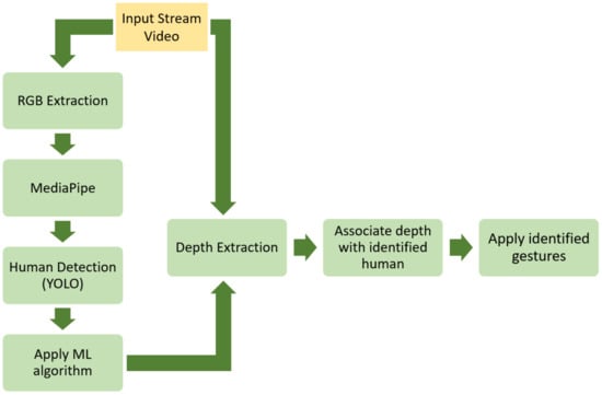The selection of the above sensors was made on the basis of the capability for Robot Operating System (ROS) integration [], which is an open-source framework related to robotic applications and constitutes an emerging framework in various fields, including agriculture [,]. When reconfiguring a robot, the implemented software should be modular and capable of being adapted to new configurations without requiring recompilation of the robot’s code. Toward that direction, ROS was selected to be the software of the present study. All processes running on UGV are registered to the same master ROS, constituting nodes within the same network []. The ROS framework was also used to navigate the UGV in the orchard. The accurate position was provided by the onboard RTK-GNSS system. In Figure 5, the operation flow of the developed system is presented. In brief, as an input, video frames from the depth camera are used. The image data are then transferred from an ROS topic to an ROS node that extracts the RGB channels from the frame along with the depth values from each frame. As a next step, the MediaPipe algorithm node incorporates the RGB channels for extracting all the essential landmarks to feed into the developed ML algorithm for gesture recognition. In addition, in conjunction with the previous step, the RGB image data are imported via a topic to a node associated with human detection. To that end, the pretrained YOLO v3 model was used with the COCO dataset []. Το communicate with the rest of the system, an ROS node was developed that requires as an input topic the RGB image of the depth camera. The output of this node is a topic with a custom message that consists of the relative coordinates of the bounding box of the identified person and the distance between the UGV and the collaborating person.