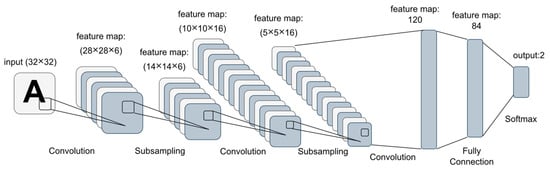 The key purpose of a CNN is to learn the relevant features of the input data. In this process, the initial layers are a set of convolutional feature extractors that are subjected to learnable filters. The applied filters serve as a sliding window that moves across every piece of input data. In this case, the overlapping distance is referred to as the stride, with the outputs being known as feature maps. Convolutional kernels make up each CNN layer, which is used to make different feature maps. Neighboring neuron areas are connected to a neuron in the next layer’s feature map. To create a feature map, the kernel must be shared across all spatial locations of the input. After the convolutional and pooling layers have been established, one or several fully connected layers are utilized to finish the classification [92,93,94,95]. As an example, Figure 2 illustrates the layers of the LeNet CNN architecture, in which each box represents a different feature map [17].