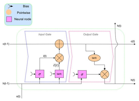 RNNs are implemented in different architectures; among them, the long short-term memory (LSTM) model is well known and widely used in IDSs. In Figure 3, the original architecture of LSTM is depicted, where the input and output gates are indicated with dashed lines.