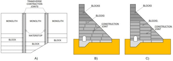 Unlike the contraction joints, the construction joints (Figure 1B,C) are temporary and shall ensure proper adhesion between blocks to obtain a monolith unit. The construction joints, which can be vertical, horizontal, and staggered, serve the purpose of reducing the initial stresses and the possibility of early cracking, which is a consequence of shrinkage, by enabling a more rapid and even emission of heat to the outside environment which surrounds the concrete. The construction joints must be previously prepared to secure a proper connection between the old and the newly cast concrete block [40].