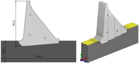 The 3D model for thermal stress analysis (TSA) has the geometry of one non-overflowing monolith of the concrete gravity dam (CGD) Platanovryssi (Greece) [42], 95.0 m high, and the surrounding rock mass of dimensions 154.0 × 50.0 m (Figure 3). By modeling the rock mass, heat exchange with the dam’s monolith is enabled.