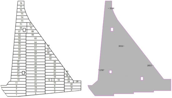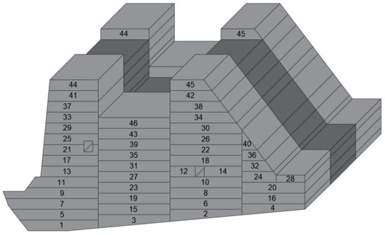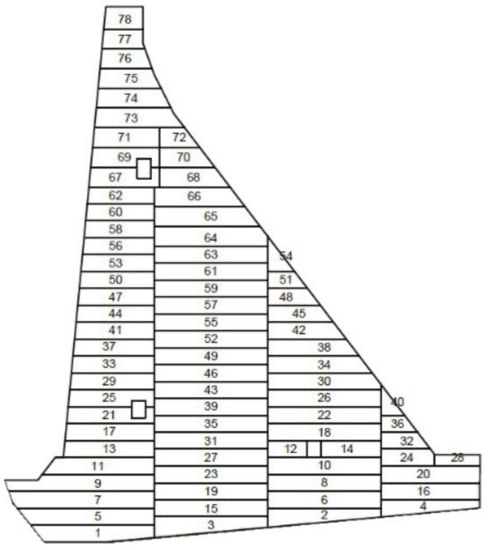 The dam’s monolith, as opposed to the model presented in [21,22], is divided into 78 blocks (Figure 4), arranged by combining long blocks and vertical joints (Figure 1C). The length of the blocks is equal to the length of the monolith (two separate analysis options with monolith lengths of 20.0 and 15.0 m are considered), the average width of the blocks is 20.0 m, while the height varies depending on the position of the block (blocks 1–63 are 3.0 m high; blocks 64–77 are 3.5 m high, while block 78 is 4.0 m high).