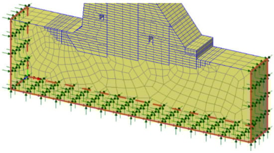 In the analysis of the stress field (SF), the displacement boundary condition is applied along the bottom, upstream, and downstream boundaries of the rock mass. In these areas, the nodal displacements (u) are restrained in all directions (Figure 6).