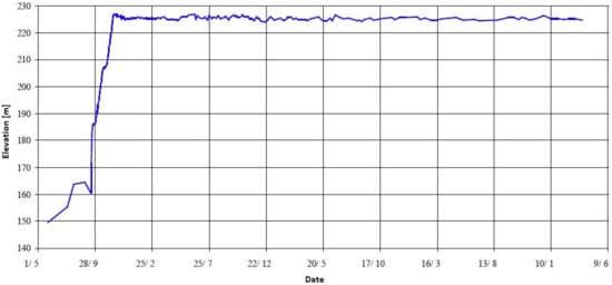 Filling of the reservoir to level 225.0 masl is applied in steps. On all blocks’ surfaces in contact with water on the upstream side, the value of the reservoir water temperature of 9.0 °C is applied [44]. Water temperature does not vary with depth as a result of the assumption of water flow resulting from the operation of the power plant intake near the upstream face of the dam. This assumption leads to the fact that the model of temperature variation through depth [45], typical for deep reservoirs, is not applied in this analysis. On the downstream side, the non-overflowing monolith is not in contact with the tailwater, and therefore the impact of the tailwater’s temperature on the structure is excluded.