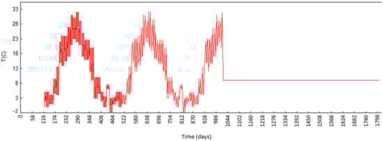 In every phase of the analysis, the ambient temperatures during construction and service life are applied on the surface of the blocks that are in contact with air [44], ranging from −2.0 to 33.0 °C (Table 1). The ambient temperatures were measured by the meteorological station that was built immediately upstream of the dam construction site. The boundary condition concerning the air temperature on the blocks’ side surfaces is applied taking into consideration the sequence of pouring of the blocks of the neighboring monoliths in space and time (Figure 5). In this case, proper cooling of a freshly cast block of the monolith considered is enabled from all sides.