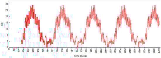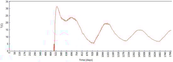 Figure 24 and Figure 25 show the extreme values of for different monolith lengths as a function of the time period after the completion of construction, and the difference in these values during the same period, respectively. The oscillations of the stresses coincide with the annual ambient temperature changes, represented as in these Figures. Figure 26 shows the extreme value as a function of the ambient temperatures .