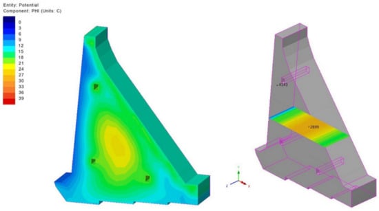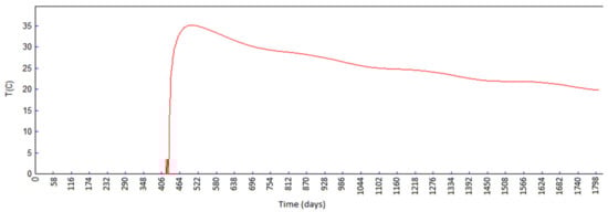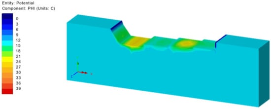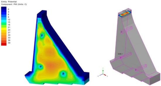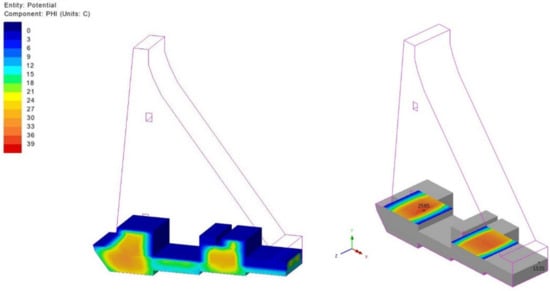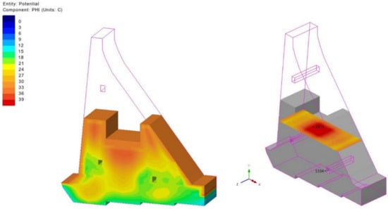 Figure 15, which shows TF for day 283 (in the moment of the summer break in concreting which lasts for 135 days—from 20 June to 02 November of the second year), presents the impact of summer temperatures on the surfaces in contact with air, which, together with the heat released from the cement hydration process, leads to the increase in the maximum temperature in the monolith’s cross-section up to 41.0 °C. The effect of high ambient temperatures during the summer break is reflected on the display of TF on day 512, at the moment of the monolith’s construction completion (Figure 16), which shows noticeably elevated concrete temperatures in the middle of the cross-section (above 41.0 °C). High air temperatures in the second time interval cause an increase in the concrete temperatures which leads to an increase in the temperature gradient during the cold days. This process leads to concrete shrinkage resulting from cooling and the emergence of TTS which, when exceeded, results in the formation and development of cracks in concrete. It should be pointed out that the summer breaks in pouring concrete, as well as the appropriate concrete curing during the break (usage of covers, moisturizing the concrete), are of exceptional importance for preventing the excessive heating of the structure. The concrete curing process during the summer break is not in the scope of this paper.