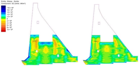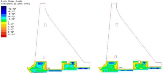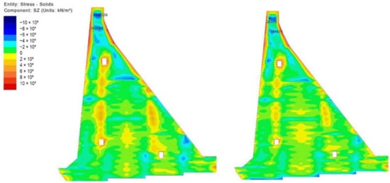 It can be noticed from the obtained results that all blocks of the dam undergo similar stress fields during construction. Instantly upon concreting one of the blocks, heating and expansion occur, as a result of the released hydration heat, which, arising from limited deformation caused by the interaction with neighboring blocks, causes compressive stresses in the block and its narrow zone (freshly cast blocks in the upper parts of the monolith in Figure 19, Figure 20 and Figure 21). The heating of one block can be additionally facilitated by the extreme air temperatures over a longer period (as described in Figure 15). Subsequently, the concrete cooling process can be abrupt (resulting from a sudden change in the seasonal temperature) or gradual (as a result of the natural process by which the concrete temperature tends to be in equilibrium with the average annual air temperature), shrinkage occurs and, as a consequence of limited deformation due to restraints provided by the adjoining blocks, the compressive stresses transform into tensile stresses.
