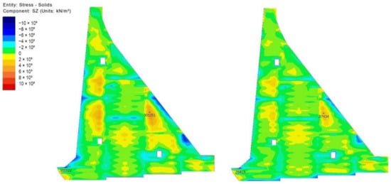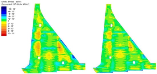 Stresses in the mid-plane of the monolith 20 m long (left) and 15 m long (right) for the 84th day (10th of January of the second year); extremums: nodes 2505 and 21,575.