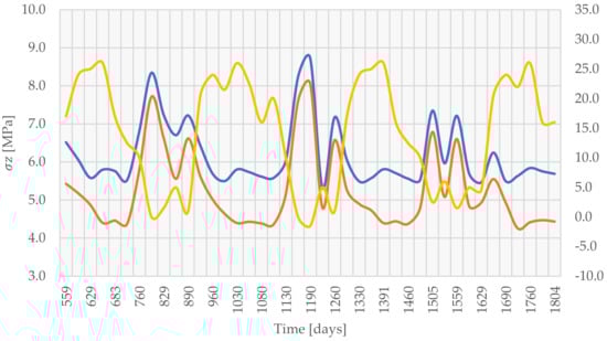 Extreme values of [MPa] as a function of the time period after the completion of construction (blue—monolith length 20.0 m; orange—monolith length 15.0 m; yellow—ambient temperature ).