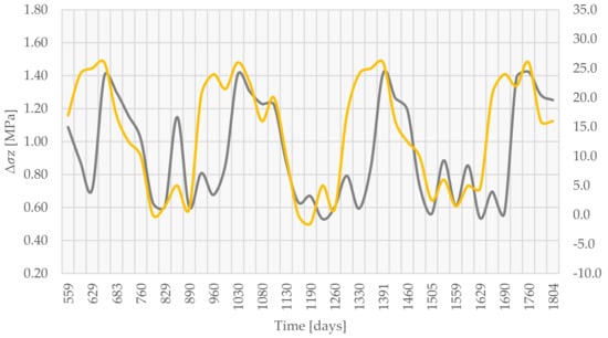 The difference between extreme values of [MPa] between two monolith lengths as a function of the time period after the completion of construction (grey) and ambient temperature (yellow).
