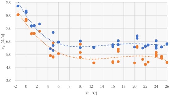 Extreme values of [MPa] as a function of ambient temperatures [°C] (blue—monolith length 20.0 m; orange—monolith length 15.0 m).
