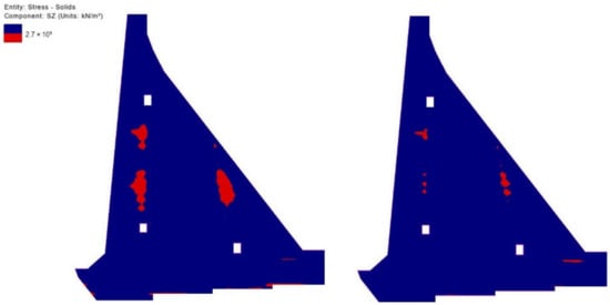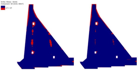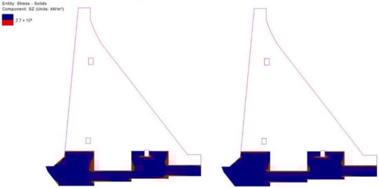 Based on the obtained results shown in the distinctive time sections in Figure 19, Figure 20, Figure 21, Figure 22, Figure 23, Figure 24, Figure 25 and Figure 26, it can be concluded that by reducing the monolith length by 5.0 m (from 20.0 m to 15.0 m), the extreme value of TTS drops by 0.93 MPa (up to 16.0%) on average (0.70 MPa (up to 12.0%) in winter and 1.10 MPa (up to 20.0%) in summer). This decrease in TTS occurs as a result of the smaller release of heat during the hydration of cement in the 15.0 m long monolith compared to the 20.0 m long monolith. The reduction in monolith length contributes to a decrease in the number of zones in which the concrete tension resistance is exceeded (Figure 27, Figure 28, Figure 29, Figure 30 and Figure 31, red-colored zones).