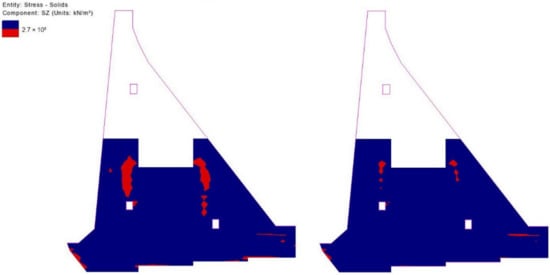 Figure 27, Figure 28, Figure 29, Figure 30 and Figure 31 show all the zones (marked red) in which the concrete tensile resistance is exceeded in the characteristic time sections for both of the monolith lengths. Figure 28, Figure 29, Figure 30 and Figure 31 confirm more clearly that the impact of the construction dynamics (faster progress of blocks between the vertical joints) contributed to the exceedance of the concrete tensile resistance in the aforementioned zones, while Figure 27 and Figure 29 clearly show the impact which a sudden cooling of the concrete in the surface regions exerts on the exceedance of the concrete tensile resistance.
