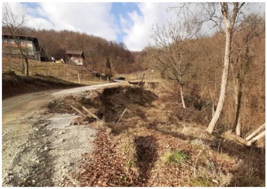 The case under consideration is that of a slope where a landslide was triggered below the local road in the fall of 2021 due to persistent heavy rainfall (Figure 2). Since the landslide had already occurred in Slake (Slovenia) and the causes of the landslide were being researched, the following was chosen for the investigation. Geological and geotechnical investigations were conducted on the slope. It should be noted that geotechnical investigations were also conducted near the site where the landslide occurred and where the soil properties were not affected by the landslide. This included field prospecting, a geodetic survey, soil soundings and sampling, ground water measurement, field testing (SPT), and laboratory testing (classification of soil, determination of unit weight, direct shear test, permeability test, oedometer test). It was determined that the soil cover of the slope consists of layers of sandy clay in a slightly to moderately kneaded state. The base of the marl is at a depth of approximately 6 m. The height of the water table depends on the season and the amount of precipitation.