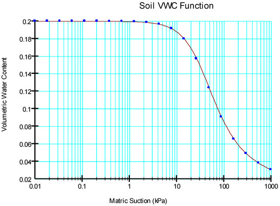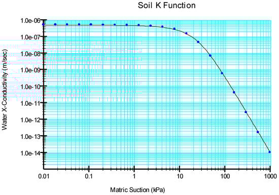 According to the Van-Genuchten and Nielsen method [28], the soil-water characteristic curve of the slope was determined, and then the permeability function curve was obtained. As shown in Figure 3, the hydraulic conductivity decreases with the increase of the matric suction, while the matric suction decreases with the increase of the volumetric water content (VWC). Therefore, the VWC is an important factor affecting the matric suction (Figure 3) and the hydraulic conductivity (Figure 4).