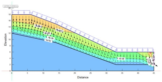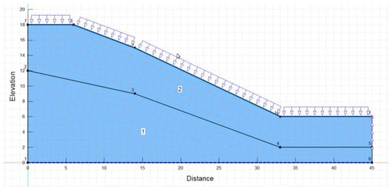 The geometry of the model is shown in Figure 5. The dimensions of the model are 45 m × 20 m, with two soil layers defined, the upper layer being sandy clay and the lower layer being marl. The mesh of the model contains elements of 1 m × 1 m. The model boundaries are also defined.