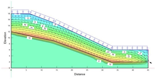 The factor of safety changes constantly after the onset of rainfall, depending on the characteristics of the slope and soil parameters. Figure 6 shows the water flow through the slope 3 days after the beginning of the rainfall.