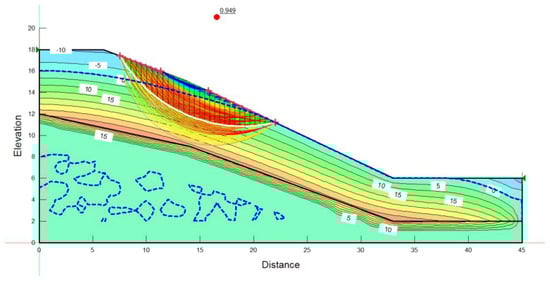 Slope with porewater pressure, critical failure line and safety factor after 3 days of rainfall.