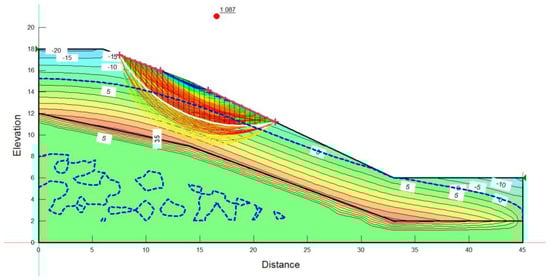 The FEM analysis, using the SEEP/W with coupling and continuous calculation of the factor of safety for all simulation time steps shows a decrease in the factor of safety from F = 1.158 at the beginning of the extreme rainfall (Figure 6) to less than 1 after the third day of rain (Figure 8).