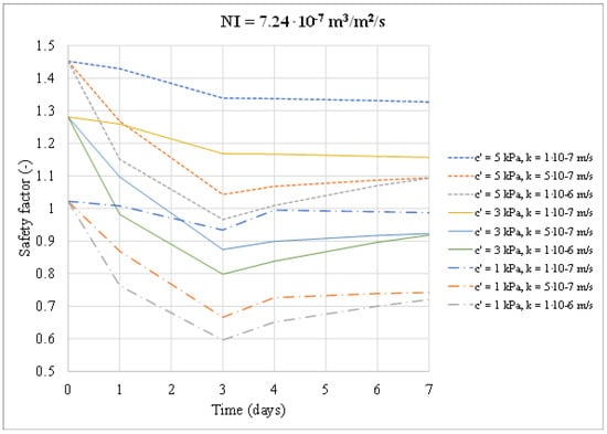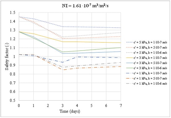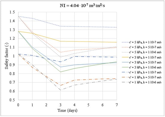 When soil permeability is low (k = 1∙10−7 m/s), the factor of safety decreases during rainfall and days thereafter, whereas when permeability is higher (k ≥ 5∙10−7 m/s), safety decreases during rainfall and increases thereafter (Figure 13).