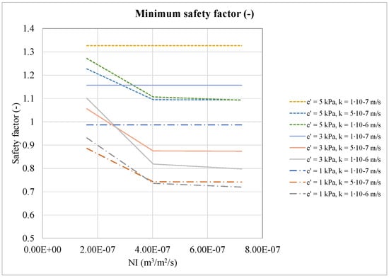 Figure 14 shows that the factor of safety decreases with increasing water net infiltration under permeable conditions. However, at low permeability (k = 1∙10−7 m/s), the factor of safety does not decrease when the value of water infiltration is higher.