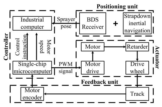 The automatic navigation system of the spraying robot, as shown in Figure 1, consists of four parts; namely a positioning unit, a controller, an actuator, and a feedback unit. Among these parts, the BDS receiver and IMU form a positioning unit, which is used to obtain the position and attitude information of the spraying robot in real-time. The controller part is composed of an industrial computer and single chip microcomputer, and the former provides sufficient computing power for the navigation control algorithm, the later provides reliable control for real-time transmission. The actuator part adopts a high-precision servo motor to drive the master wheel through the reducer, and the master wheel outputs power to the track, which controls the track with high precision and high torque to realize the motion control of the spraying robot. The feedback unit detects the servo motor speed through a single chip microcomputer, then transmits it to the industrial computer and forms a closed-loop control.