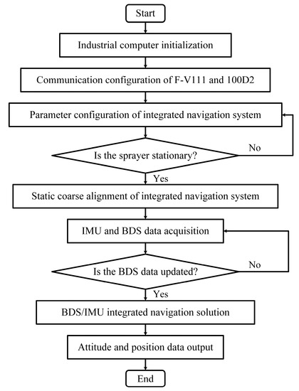 The integrated navigation program is shown in Figure 5. The on-board navigation system is powered on to initialise the industrial computer, F-V111 receiver, 100D2, etc. (1) The industrial computer checks the motherboard, graphics card and memory, and initializes peripherals such as the USB port; (2) The F-V111 receiver and 100D2 are configured; (3) The parameters of the integrated navigation system are configured, including the initial zero deviation and installation error angle of the 100D2, the bar arm between the F-V111 receiver antenna and 100D2, and the initial state vector , the initial error estimation covariance matrix , the initial system noise variance matrix , the initial measurement noise variance matrix ; (4) The system enters polling and the performs static coarse alignment under the static state of the sprayer. The initial pitch angle and roll angle are calculated by the accelerometer of IMU, and the initial heading angle and longitude and latitude are calculated by F-V111 receiver; (5) The data of 100D2 is collected and the data of F-V111 receiver is waiting to be updated; (6) The longitude and latitude are obtained, and the integrated navigation solution is carried out to obtain the heading angle and position of spraying robot; (7) The system polls for the data of 100D2 and waits for the next data of F-V111 receiver update.
