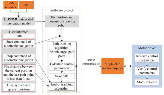 The automatic navigation control system of the spraying robot was composed of the path tracking system. The structure of the path tracking system is shown in Figure 6. The path to be tracked is selected through the user interface and the automatic navigation start command is sent. The sprayer obtains the real-time information of position and heading, the path tracking algorithm searches the target point on the path and calculates the control parameters, sends the control parameters to the single chip microcomputer through the RS232 communication interface. The single chip microcomputer verifies the integrity of the control parameters, converts them into PWM signals to send to the servo motor driver, which controls the motor to drive the crawler moment. The path tracking algorithm keeps cycling until the distance between the actual position of the spraying robot and the last path point is less than 0.1 m or the automatic navigation termination command is sent out.