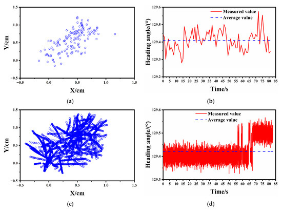 The positioning results of the spraying robot in the static experiments. (a) Positioning measurements of BDS in static state; (b) Heading angle measurements of BDS in static state; (c) Positioning measurements of BDS/IMU in static state; (d) Heading angle measurements of BDS/IMU in static state.