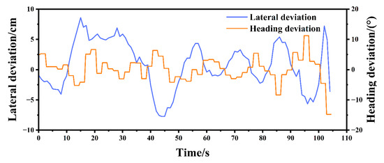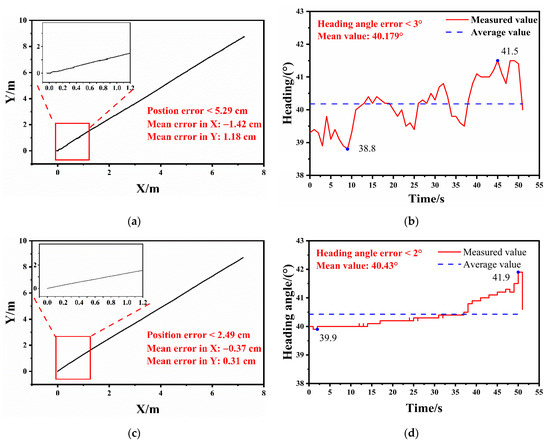 The performance of the navigation system was tested under the straight-line driving state of the spraying robot, and the BDS positioning and BDS/IMU integrated positioning were compared. In the test, the spraying robot ran along the preset straight line at a speed of 0.4 m/s, both BDS and BDS/IMU integrated positioning data were output. The heading angle and path data of the spraying robot for the BDS positioning and the BDS/IMU integrated positioning are shown in Figure 11. In BDS positioning, the position error was less than 5.29 cm, the mean errors in X and Y directions were 1.42 and 1.18 cm, and the variances were 1.95 and 1.35, respectively. The heading angle error was less than 3°, the mean value was 40.179°, and the variance was 0.5543. In BDS/IMU integrated positioning, the position error was less than 2.49 cm, the mean errors in X and Y directions were −0.37 and 0.31 cm, and the variances were 0.87 and 0.60, respectively. The heading angle error was less than 2°, the mean value was 40.430°, and the variance was 0.237.