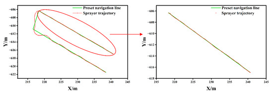 In order to verify the reliability and rationality of the automatic navigation system mounted on the sprayer, a linear navigation test was carried out in the orange orchard, as shown in Figure 12. The spacing of planting rows was 5 m, and the ridge length was about 35 m. Considering the outstretched part of the branches of orange trees, the actual width of the walkable area between ridges was 2 m, and the width of the body was 0.62 m. Therefore, the minimum safe distance was 0.69 m, which satisfied the path planning requirements. Two continuous ridges of orange orchards were randomly selected as the test site. Before the test, the high-precision positioning board was used to collect the coordinates of points 1–4 on the planned path, the path planning scheme shown in Figure 9 was employed for the orchard path tracking test and the automatic navigation driving speed of the sprayer was 0.4 m/s. The experiment was conducted at the fruit tree Innovation Park of the Horticultural Research Institute of Hunan Academy of Agricultural Sciences, Changsha City, Hunan Province on 7 April 2022.