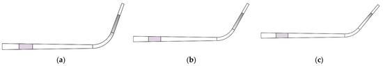 As one of the key structural design parameters of the rotary tiller [24], the selection of its parameters has an important impact on its overall cutting performance. Three parameters were selected for modeling: 110°, 120°, and 130°. As shown in Figure 4, the influence of the bending angle on its performance was analyzed.