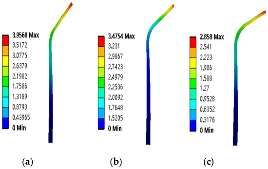 The deformation region and numerical cloud diagram were calculated, as shown in Figure 5. The average deformations calculated by simulation were 0.94 mm, 1.13 mm, and 1.22 mm. The average stress was 39.67 Mpa, 45.39 Mpa, and 50.98 Mpa. It can be seen that the stress and deformation increase with the increase of bending angle in the range of 110–130°, and the relationship can provide reference for subsequent structural parameter optimization.
