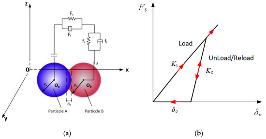 By measuring the field soil solid rate, moisture content, and other data via access to the China Soil Database [25] it was determined that the test soil was gray desert loess, in soil particle size and shape. Plastic material was chosen, according to the test soil types, to create a delayed elastic contact model (hysteretic spring contact model, HSCM). The contact model between the particles of the physical model is shown in Figure 6a. The model allows the plastic deformation behavior to be added to the contact mechanics equation, so that, since a predefined stress particle displays an elastic behavior, once the stress is exceeded, the particle behaves as if it is undergoing plastic deformation. The result is a large overlap without excessive force to characterize a compressible material. The exact location of each old contact point is not “remembered”, so the particles become undeformed once they are separated. Subsequent contacts will be loaded along the new loading route of slope K1, and any reloading prior to separation is loaded at slope K2 until the original loading curve K1 is reached, followed by this slope until unloading occurs, the schematic diagram of the model force–displacement relationship is shown in Figure 6b.