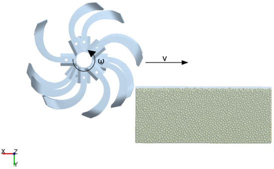 According to the cutting mode and boundary conditions of the rotary tillage cutter roll, a 1200 × 600 × 250 mm cuboid soil trough model was constructed as follows: a 1200 × 600 × 250 mm cuboid soil trough model was constructed and a virtual surface was built on top of it, then 1.8 × 106 soil particles were generated to fill the soil bin to realize the soil environment simulation. At the same time, the cutter roll was set to rotate the soil counterclockwise, and the forward speed v = 1100 m/h, and the rotational speed n = 20 r/min were defined as consistent with the test. The cutter roll–soil groove interactive discrete- element model is shown in Figure 8.